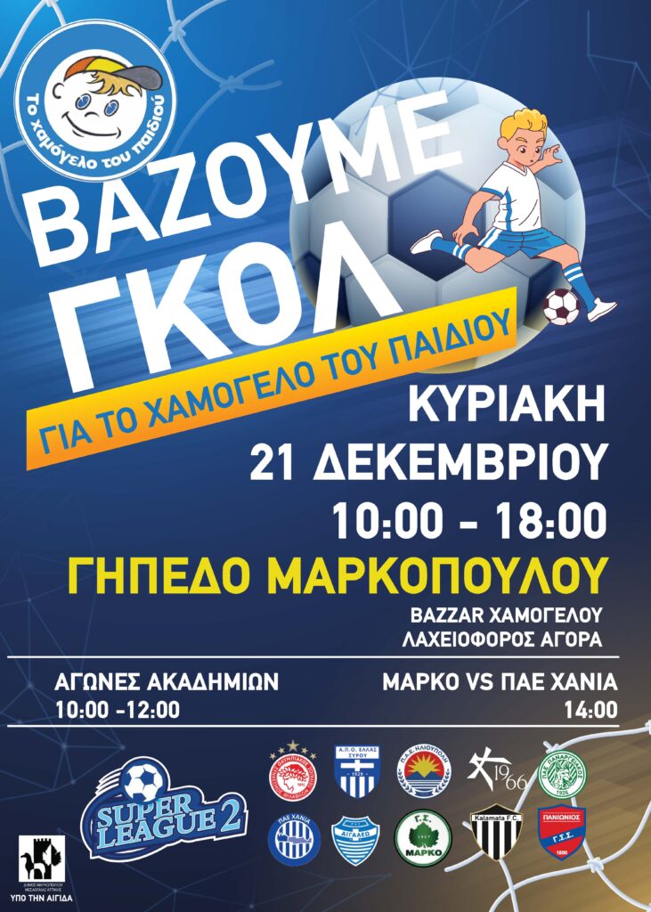 Η Super league 2, στο πλαίσιο της εταιρικής και κοινωνικής ευθύνης των κοινωνικών της δράσεων, διοργανώνει την Κυριακή 21 Δεκεμβρίου2025 , από τις 10:00 έως 18:00μ.μ. μια ολοήμερή δράση αθλητισμού και αλληλεγγύης με τίτλο ‘’Βάζουμε γκολ για το Χαμόγελο του Παιδιού’’, στο ΔΗΜΟΤΙΚΟ ΣΤΑΔΙΟ ΜΑΡΚΟΠΟΥΛΟΥ .